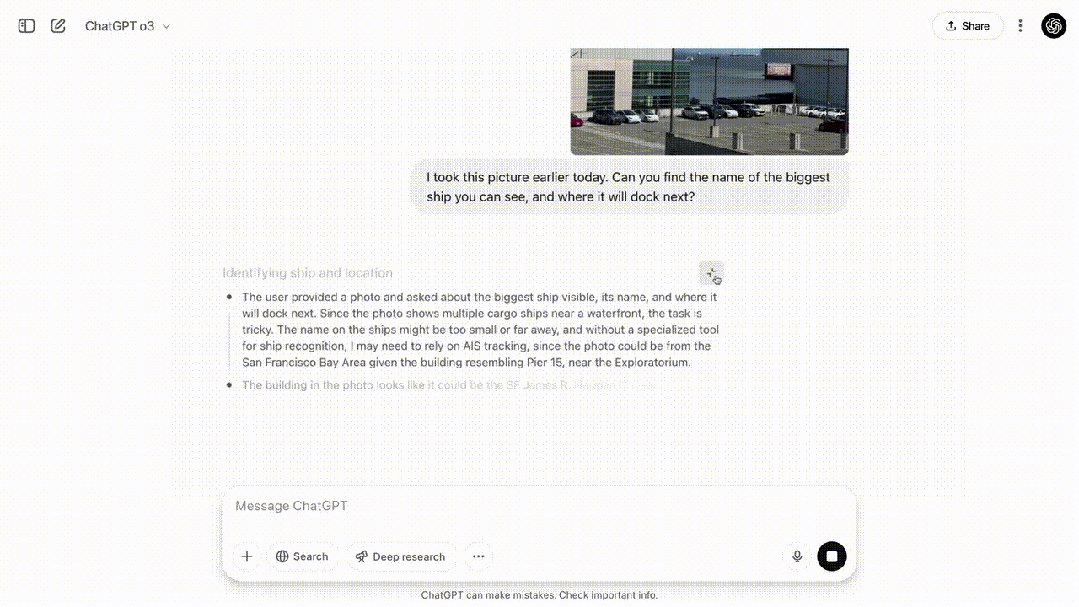 它能将高级推理与网页搜索、图像处理等工具无缝结合,自动放大、裁剪、翻转或优化你的图片,哪怕照片不完美也能挖掘出有用信息。