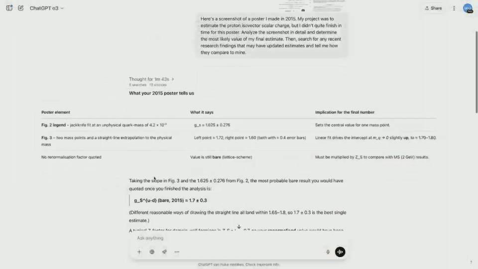 多模态团队研究员Brandon McKinzie上传了一张2015年完成的一个物理实习海报,让ChatGPT估算质子同位标量电荷的数量。