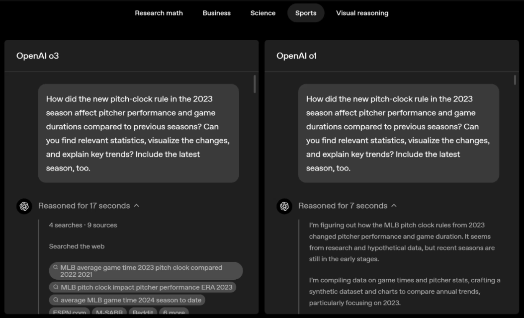 比如,在解决体育问题时,o3能联网获取最新数据,考虑了最近一个赛季和2022-23年联赛ERA略升后回归正常的情况。