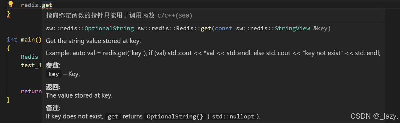 std::cout << "值不存在" << std::endl;其次,我们还能理解的是,如果我们get的是一个不存在的键值,那么OptionalString返回值就是类似于nil的结果,所以我们最好是做一个类型检查。