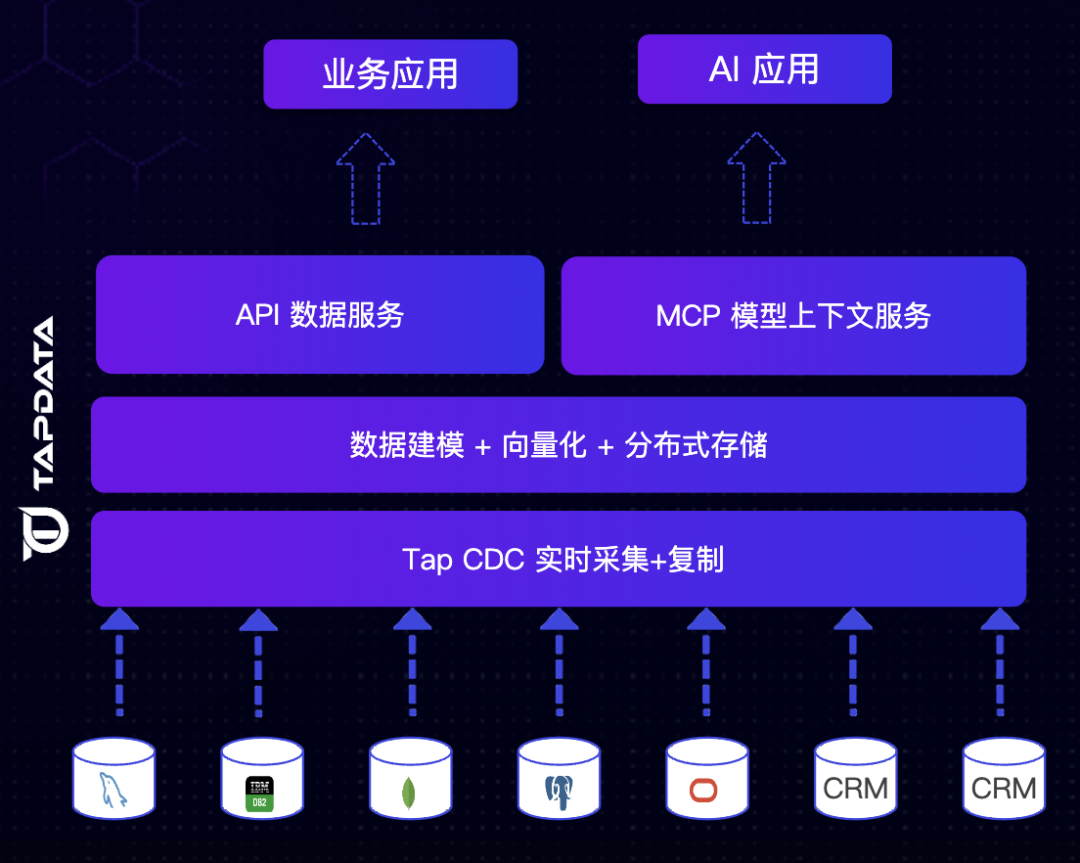 依托 CDC 实时数据采集引擎与模型上下文服务能力,TapData 构建起从“数据源 → 数据建模 → API/MCP服务 → AI/业务系统”的闭环通路,成为 AI 应用可信的数据底座。