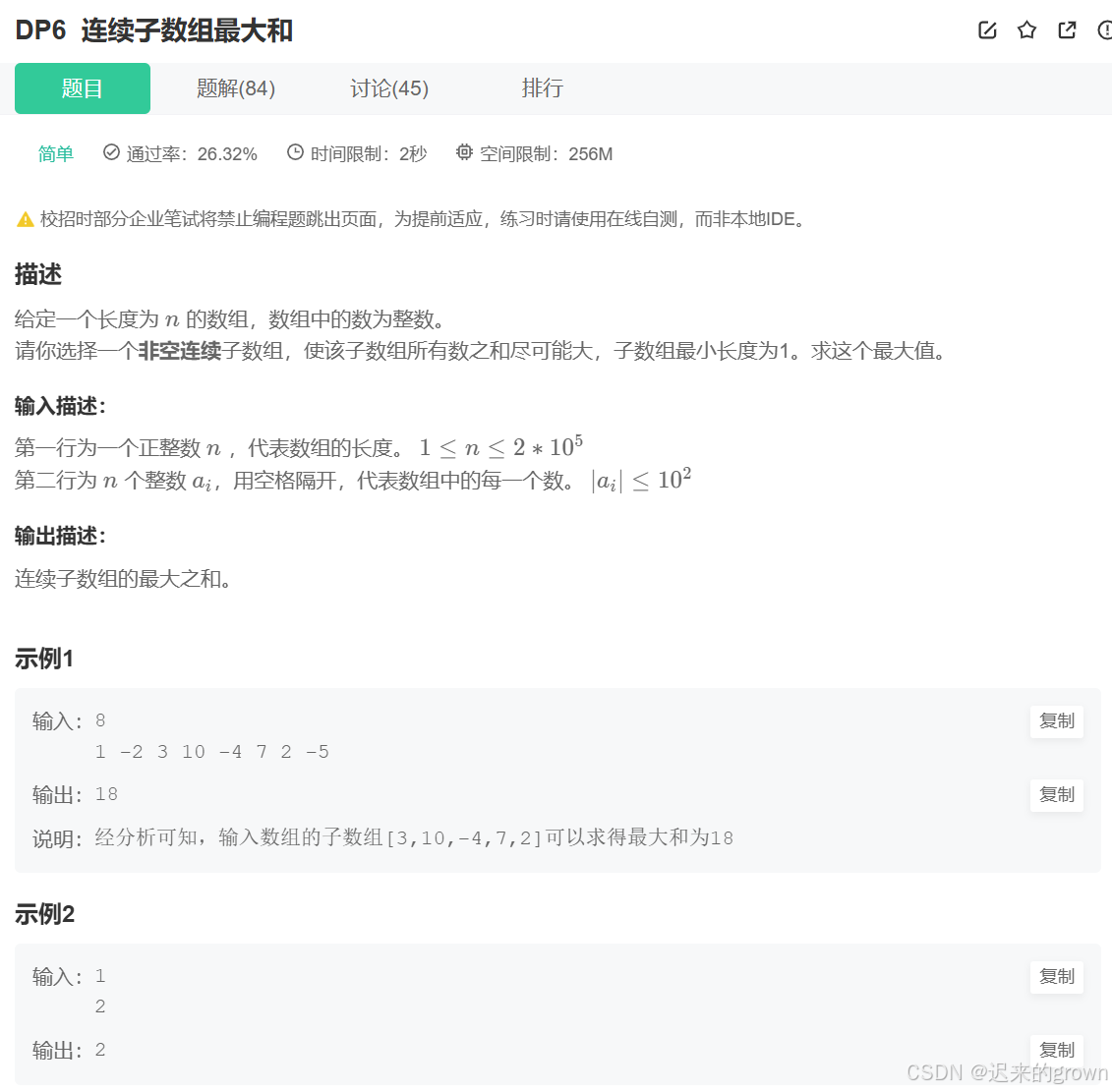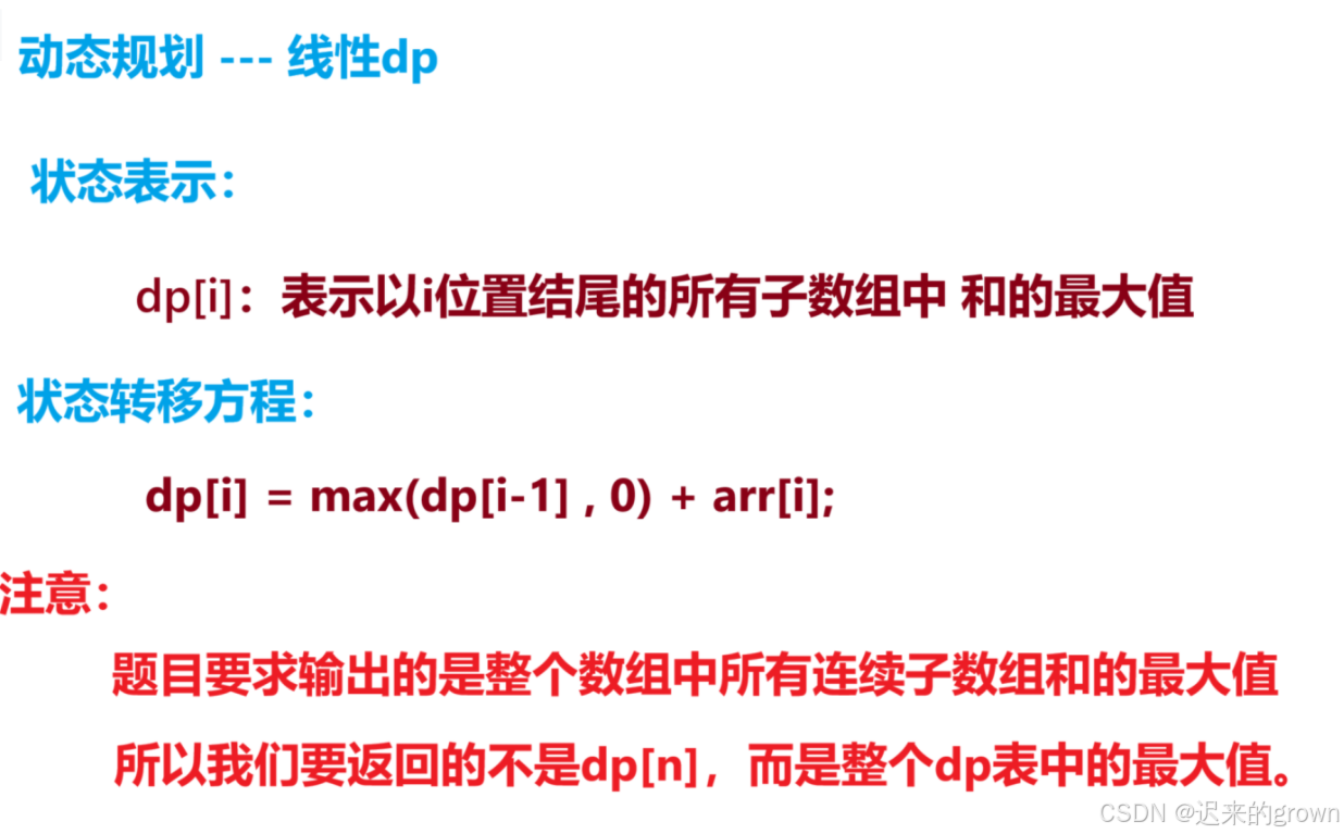 这里注意:我们dp[i]表示的是以i位置为结尾的连续子数组所有数和的最大值,但是题目要求我们返回的是整个数组中,连续子数组中所有数和的最大值,所以我们要找出来整个dp表中的最大值。