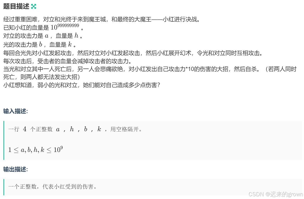 10^999999999,光的攻击是a、血量是h,对立的攻击是b、血量是k; 每一回合光先对小红发起攻击,然后独立再对小红发起攻击,然后小红发动幻术,让光和对立同时相互攻击; 当光和对立其中一个人死亡后,另一个就会悲痛欲绝,然后对小红发动大招,伤害是自身攻击力*10,然后自杀(如果光和对立同时死亡,都无法放出大招)。 最后我们要求出小红受到的伤害