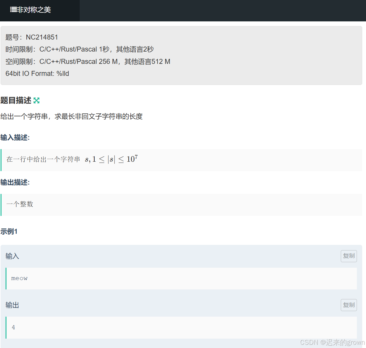 这道题,给我们一个字符串,让我们找出这个字符串中最长的非回文字符串的长度。
