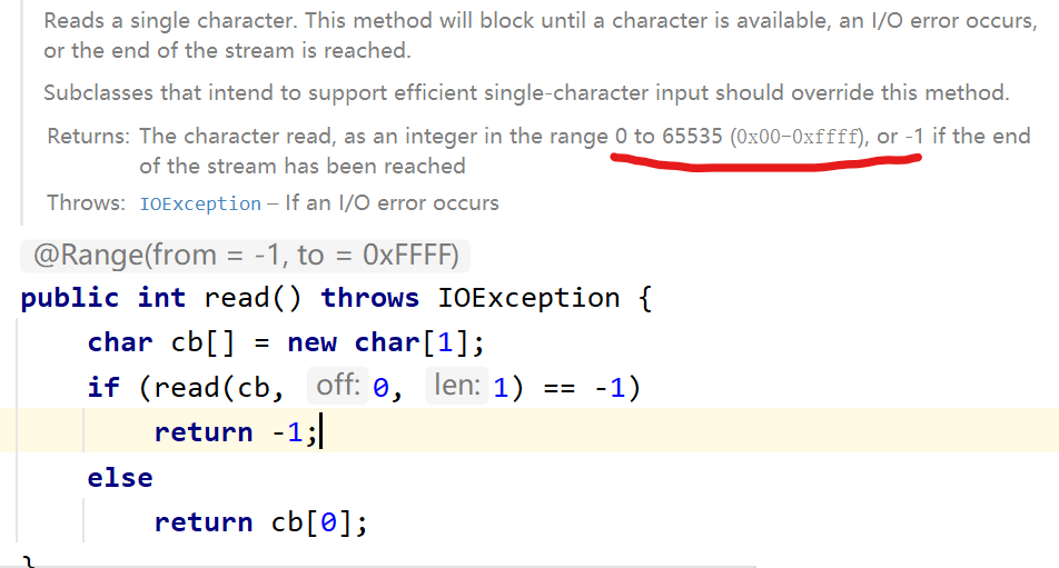 我们知道当read()方法返回-1时,说明已经读取完毕,如果用byte就接收不了-1了. 同样地,在字符流中也是用int类型作为返回值类型. 一个字节,8个比特位,2^8 - 1= 255 所以范围是[-1,255]