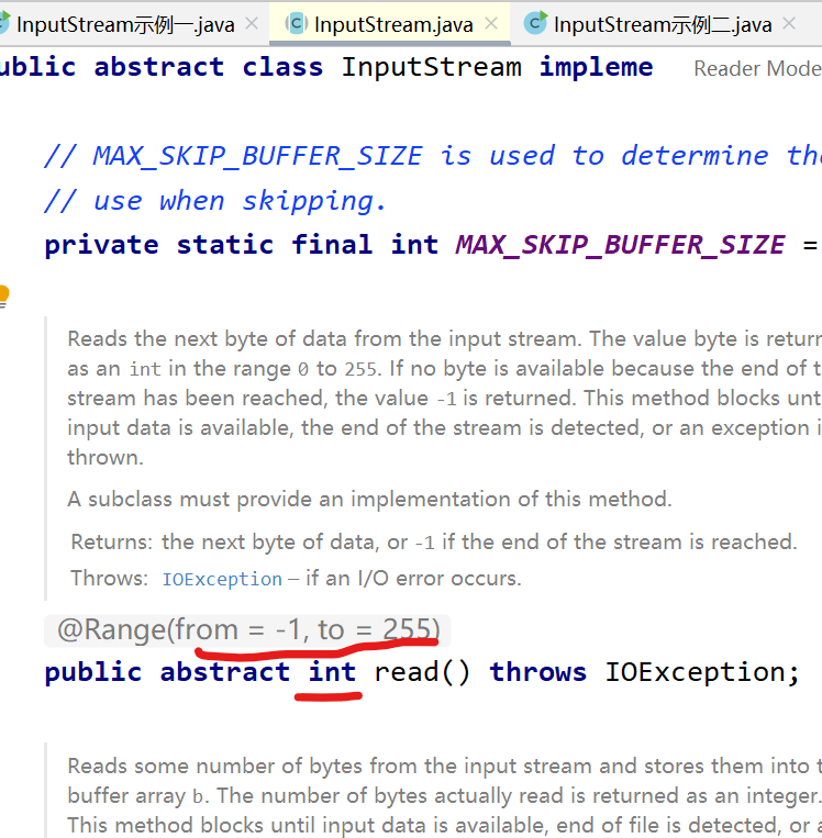 InputStream只是一个抽象类, 要使用还需要具体的实现类. 关于 InputStream 的实现类有很多,基本可以认为不同的输入设备都可以对应一个 InputStream 类,我们现在只关心从件中读取,所以使用 FileInputStream. 注意抽象类不能new实例,只能new子类.