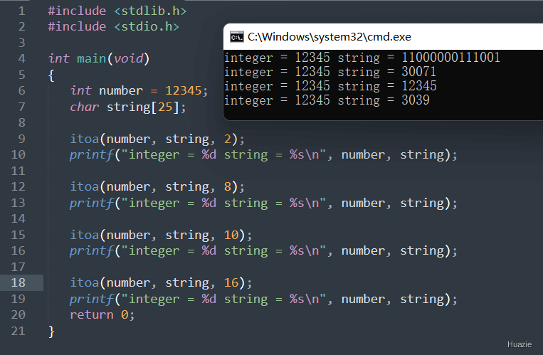value : 被转换的整数string : 转换后储存的字符数组radix : 转换进制数,如2,8,10,16 进制等,大小应在2-36之间#include <stdlib.h>