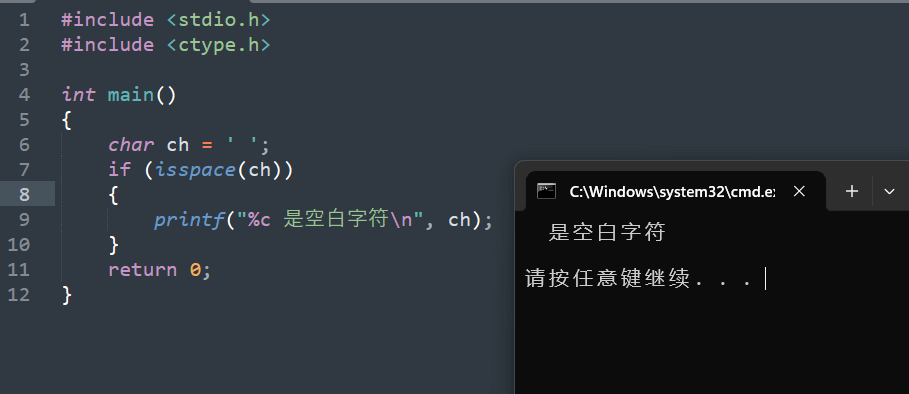 | 检查字符 c 是否为空白字符,如空格(' ')、制表符('\t')、换行符('\n')等。 |