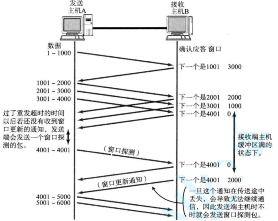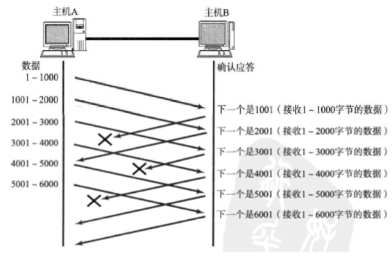 这里无妨,上面说过,因为确认序号的原因,收到确认序号了,确认序号之前的默认就全收到了,允许少量的ACK丢失。 因为可以根据下标更新滑动窗口,例如1001ACK,3001ACK,4001ACK应答未收到,但是6001有应答,滑动窗口就会将1-6000变成已发送已确认的区域。 场景二:数据包直接丢了 如果整个数据包丢失,那么发送的主机滑动窗口就不会跳过丢失的数据段向后滑动: