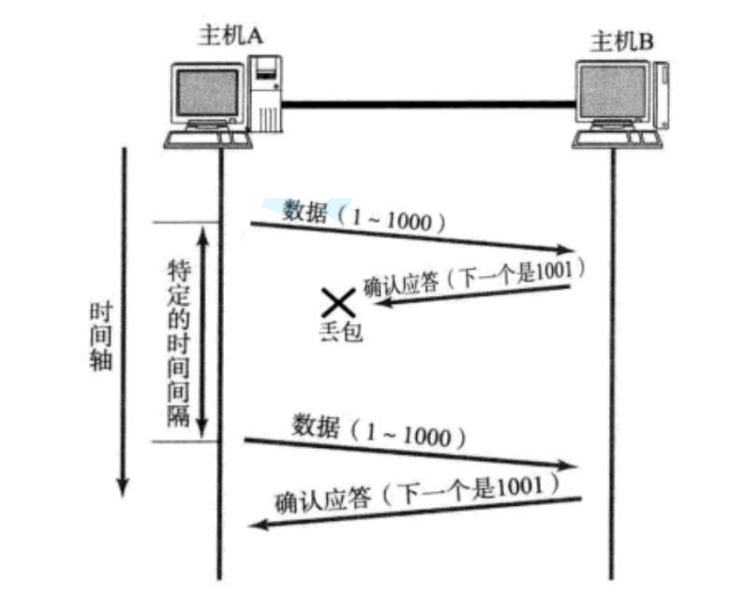 主机 A 发送数据给 B 之后, 可能因为网络拥堵等原因, 数据无法到达主机 B; 如果主机 A 在一个特定时间间隔内没有收到 B 发来的确认应答, 就会进行重发;(这就叫超时重传) 场景二: 但是, 主机 A 未收到 B 发来的确认应答, 也可能是因为 ACK 丢失了;