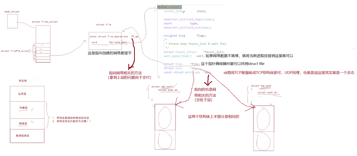 创建一个套接字,底层其实创建了很多个结构体,并且层层指针叠加,互相指引。