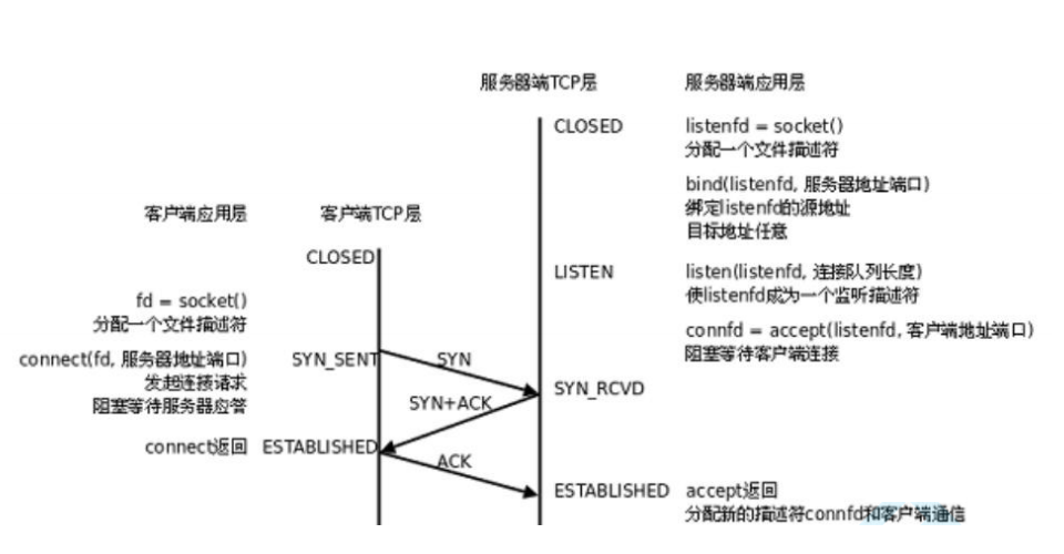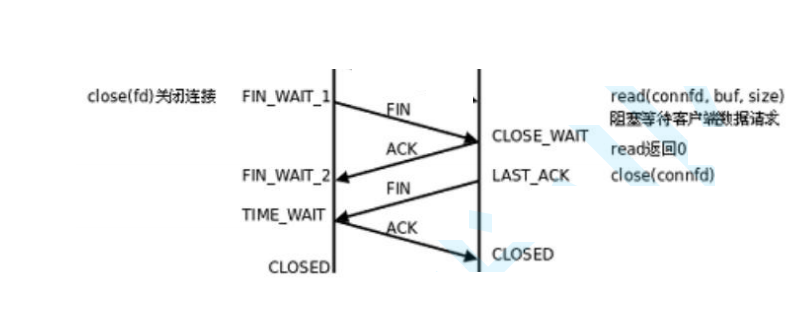 客户端在使用connect的时候,先发出SYN后,然后OS进行接手,双方的OS在底层进行TCP建立连接,在这个过程中connect在阻塞等待。服务器的accept也不会参与三次握手的过程,它只负责获取建立好的连接,如果没有建立好的连接,就会一直阻塞住。 并且,在双方建立对应连接的时候,都是有状态的,客户端发送请求连接会处于SYN_SENT(同步发送),服务器收到会处于SYN_RCVD(同步接收),然后在响应给客户端,客户端接收到状态就会变成ESTABUSHED(也就是建立连接成功,注意这时服务器还不是ESTABUSHED,也就是上面所说的在客户端响应到达之后才建立成功),最后客户端发送给服务器响应,服务器接收到状态就变成了ESTABUSHED。 四次挥手(断开连接)