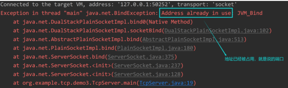 Socket编程注意事项 ① 客户端和服务端:开发时,经常是基于一个主机开启两个进程作为客户端和服务端,但真实的场景,一般都是不同主机. ② 注意的IP和目的端口号,标识了一次数据传输时要发送数据的终点主机和进程. ③ Socket编程我们是使用流套接字和数据报套接字,基于传输层的TCP或UDP协议,但应用层协议,也需要考虑,这块我们在后续来说明如何设计应用层协议。 ④ 关于端口被占用的问题 如果一个进程A已经绑定了一个端口,再启动一个进程B绑定该端口,就会报错,这种情况也叫端口被占用。对于java进程来说,端口被占用的常见报错信息如下: