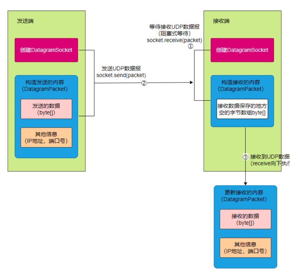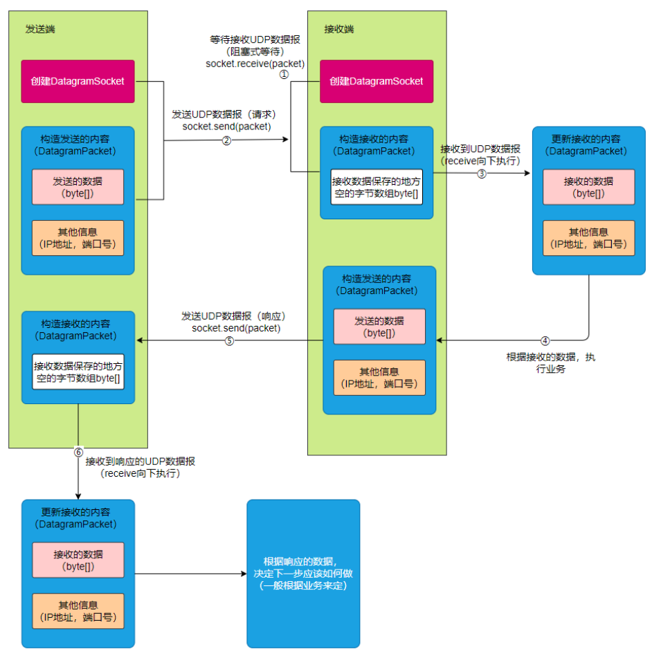 对于UDP协议来说,具有无连接,面向数据报的特征,即每次都是没有建立连接,并且一次发送全部数据报,一次接收全部的数据报。 java中使用UDP协议通信,主要基于 DatagramSocket 类来创建数据报套接字,并使用DatagramPacket 作为发送或接收的UDP数据报。对于一次发送及接收UDP数据报的流程如下:
