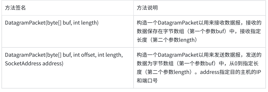 2. DatagramPacket DatagramPacket是UDP Socket发送和接收的数据报。 DatagramPacket 构造方法: