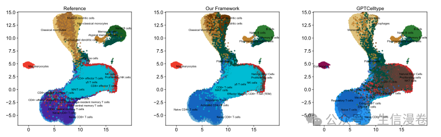 b,我们框架注释的 UMAP 可视化,与参考注释相比显示了高注释准确性。按照与参考相同的分层聚类方法,我们的框架逐级执行细胞类型注释。在每个级别,向 LLMs 提供全局标记基因(在一个簇中特异表达的基因,与所有其他簇相比)和姐妹标记基因(目标簇与同一父簇内的姐妹簇之间差异表达的基因),以及来自前一级别的父簇注释,以指导注释过程。