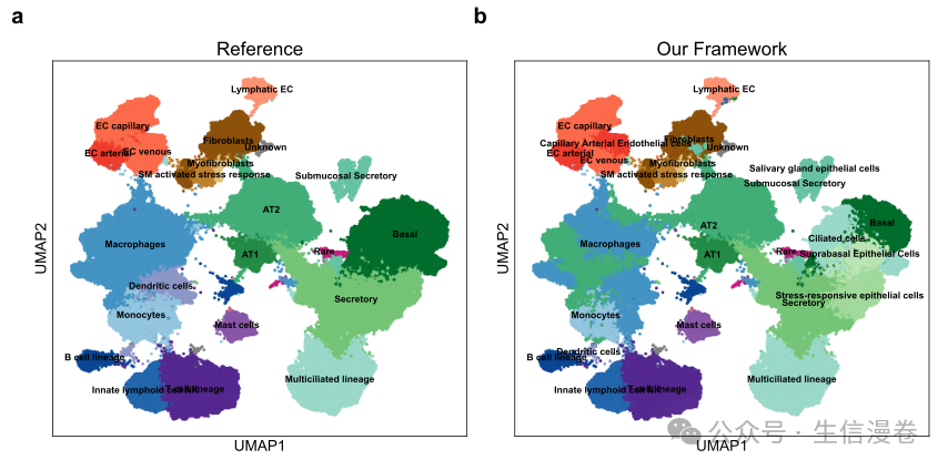 b, UMAP 可视化图展示了我们框架的注释,在与参考注释评估时显示出高注释准确性(76.6%),成功捕捉了复杂的发育过渡和多样的免疫细胞群体。