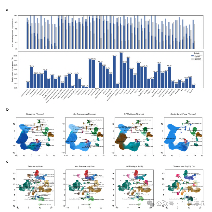 c,肺细胞图谱(LCA)的性能比较。UMAP 可视化显示参考(第一),mLLMCelltype 预测(第二),GPTCelltype 预测(第三),以及群组级别 popV 预测(第四)的细胞类型注释,按细胞类型着色。