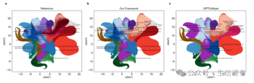 c, UMAP 可视化展示了 GPTCelltype 的注释,其准确性低于我们框架,特别是在区分相关神经前体状态和专门的神经亚型方面。
