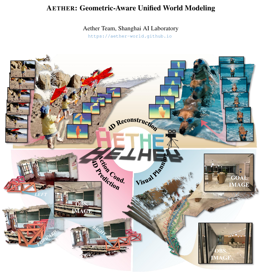 不同于传统仅预测图像变化的世界模型,AETHER 不仅能同时完成四维时空的重建与预测,还支持由动作控制驱动的场景推演与路径规划。值得强调的是,该方法完全在虚拟数据上训练,即可实现对真实世界的零样本泛化,展现出强大的跨域迁移能力。