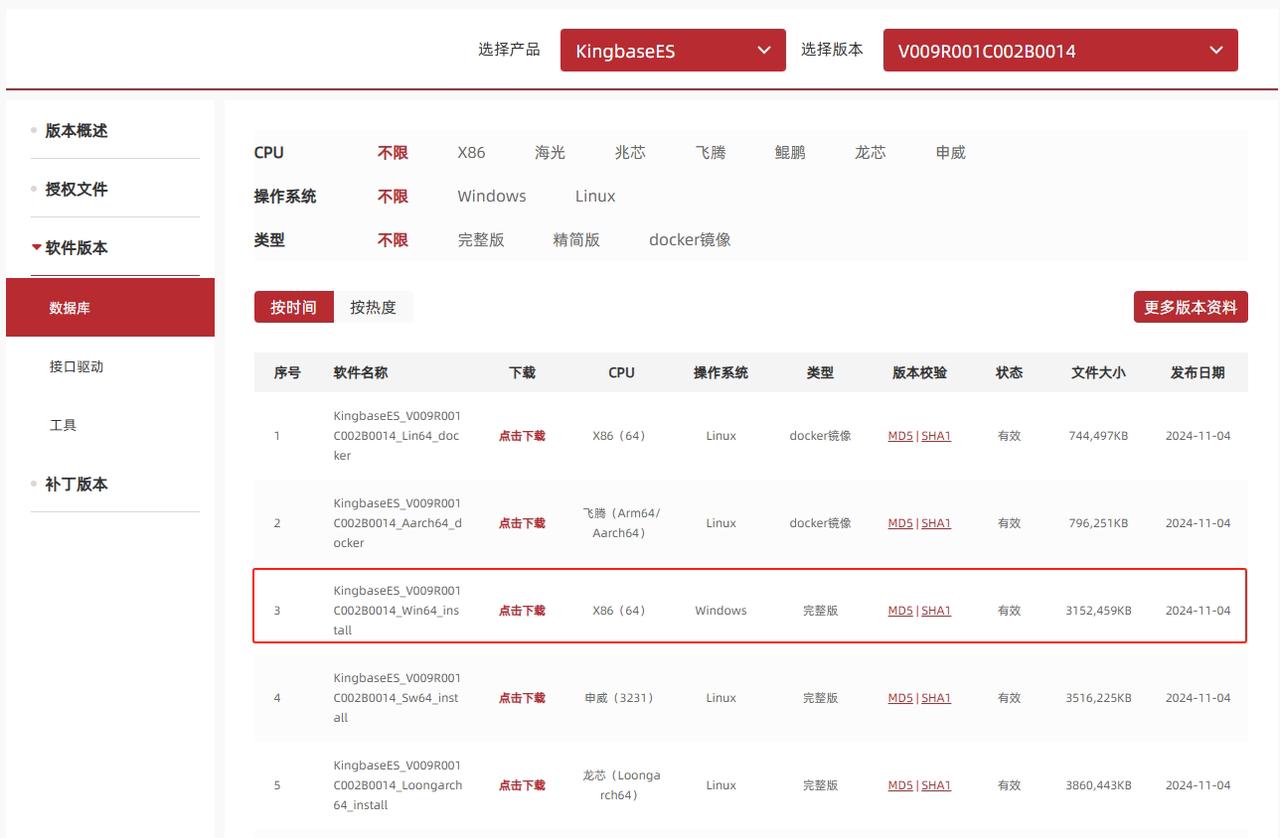 金仓官网提供了金仓各产品各版本的安装包、补丁包、对应的工具、接口驱动、授权文件等下载服务。可以通过页面中的筛选栏选择所需产品及版本进行下载,我这里下载的是windows版本的x64完整版金仓数据库。