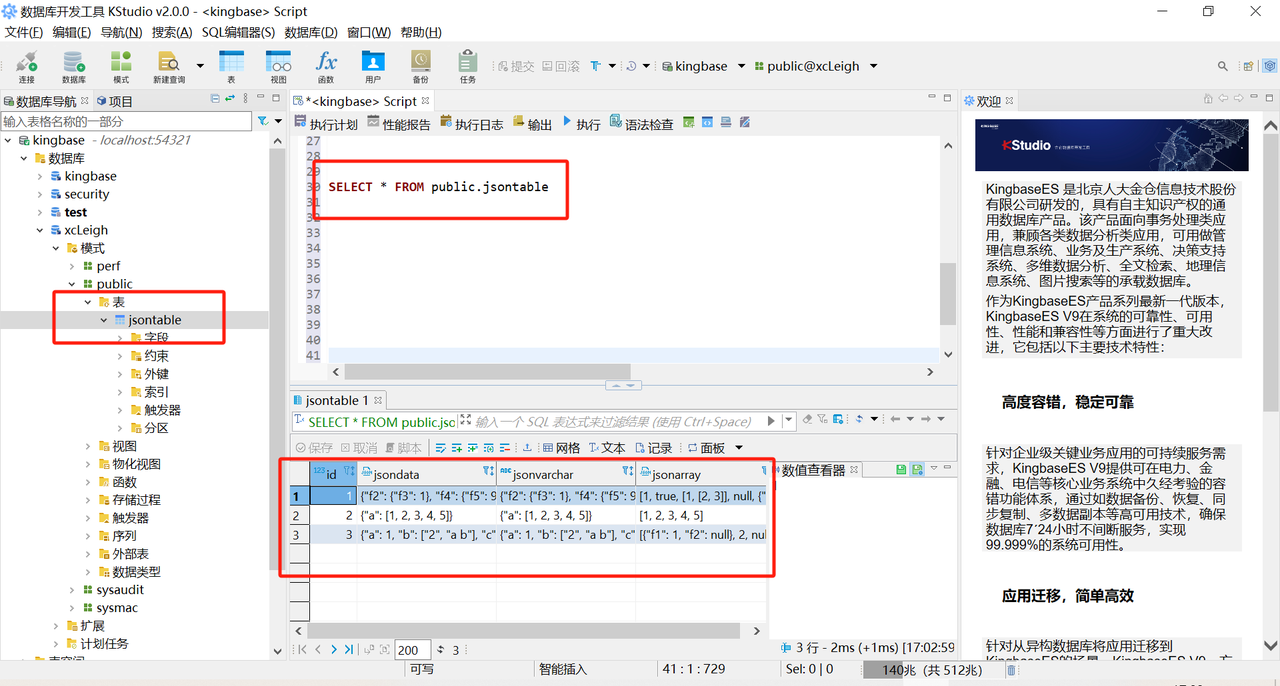 在对数据库的使用中,可能需要把关系数据或者一个行对象转为JSON对象或JSON数组,KingbaseES提供了JSON构造函数来生成JSON数据。