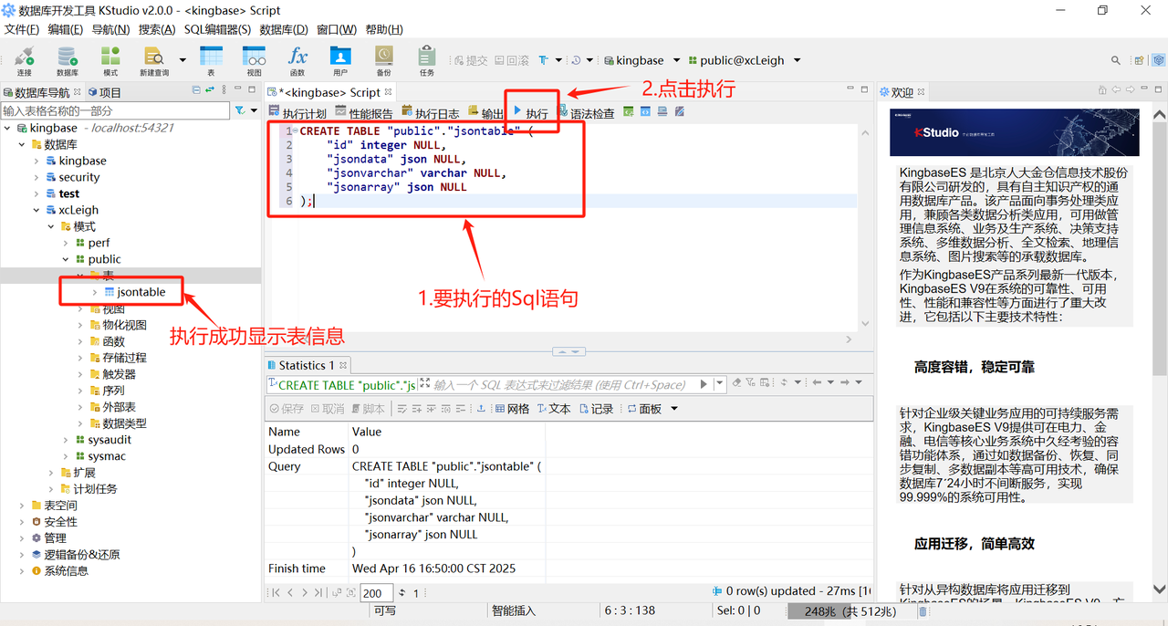 打开 SQL编辑器 》输入建表SQL语句 》点击执行。表jsontable就创建成功了。