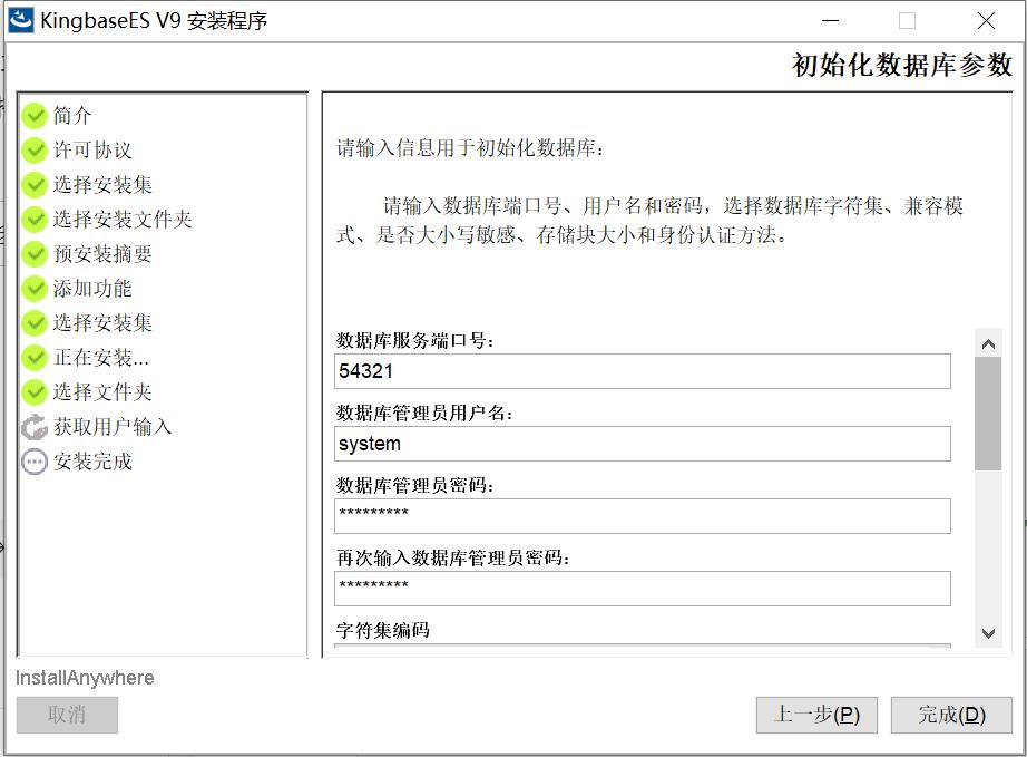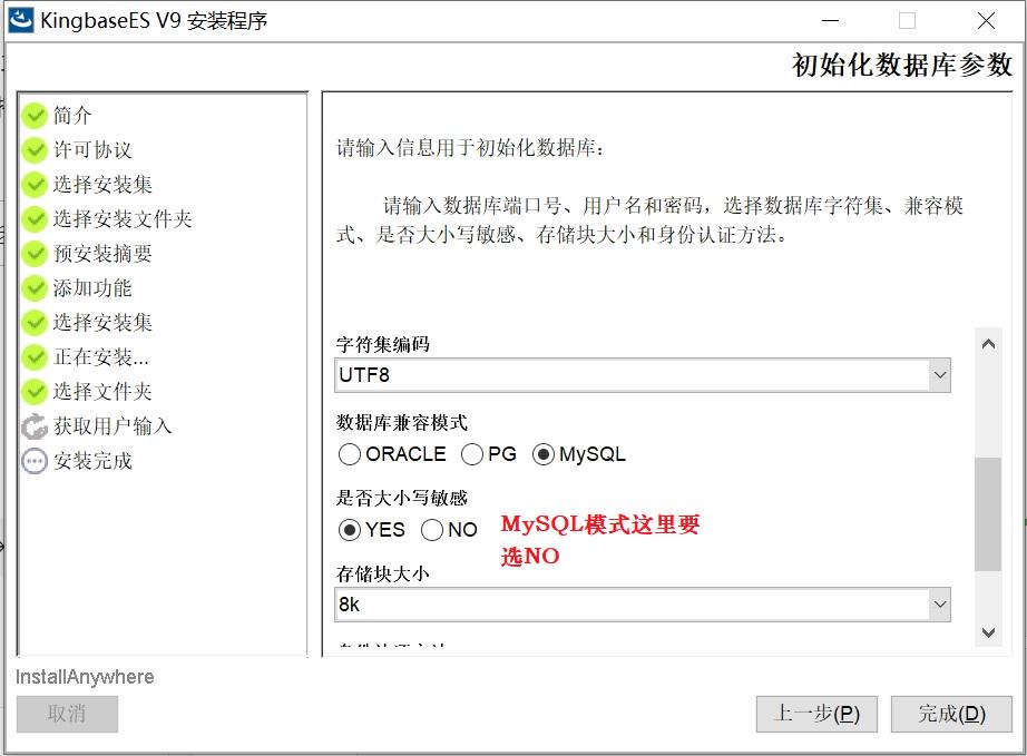 填写相关配置信息,system的密码自定义,字符集编码,选择的是UTF8;数据库兼容模式选择的是MySql;是否大小写敏感选择的是NO,存储块大小选择的是8K,点击 完成