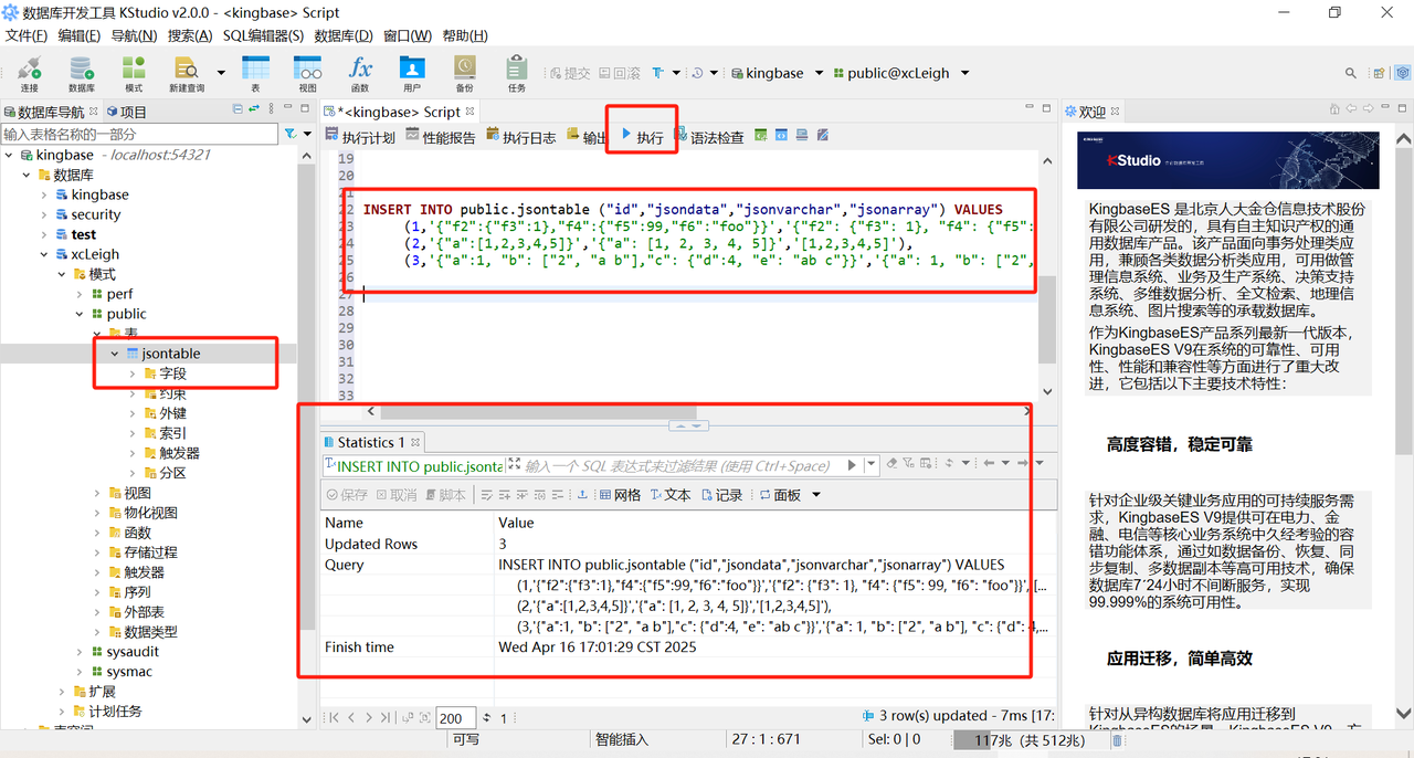 打开 SQL编辑器 》输入插入数据的SQL语句》点击执行。表jsontable的数据就新增成功了。