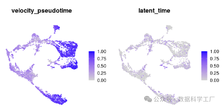 另外,scvelo 还能利用估算出的 RNA 速度来生成伪时间。它支持两种速度伪时间计算方式。一种叫“速度伪时间”,计算方法跟前面提到的扩散伪时间有点像。不同之处在于,扩散伪时间用的是基于扩散图嵌入算出来的对称转移矩阵来模拟随机游走,而速度伪时间用的是 RNA 速度估算出的带有方向性的转移矩阵。还有一种叫“潜在伪时间”,完全依靠速度的动态变化来生成。