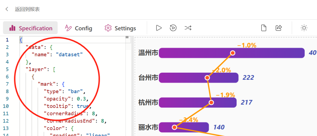 条形图和纵向折线图组合常用来展示绝对值和率值的组合。之前在知识星球分享过SVG的版本(使用内置表格加载),今天换一种实现方式,使用Deneb视觉对象: