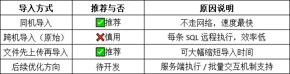 当前 imp 的执行机制偏“轻客户端”,每条 SQL 单发,虽然逻辑清晰,但在跨网络环境中效率较低。