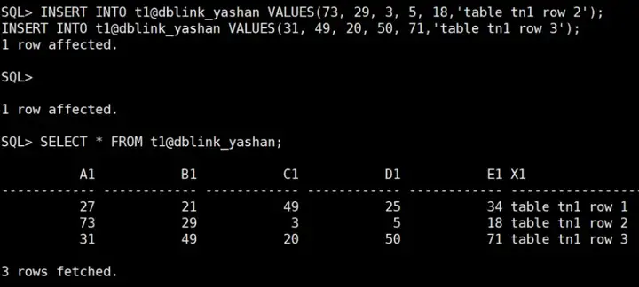 select * from t1@dblink_yashan;insert into t1@dblink_yashan values (...);支持多条插入、更新、删除等操作:
