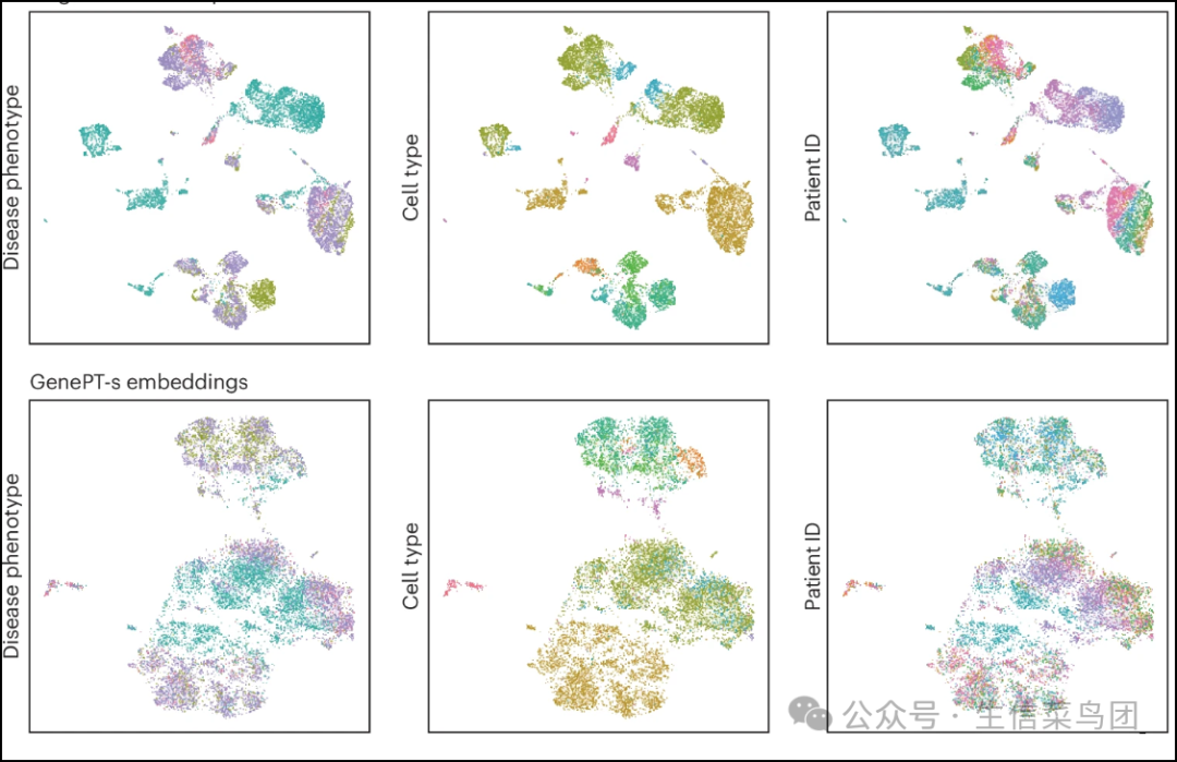 - 虽然原始数据主要按患者身份分组,并且即使对于相同的细胞类型也显示了不同的簇,但GenePT-s嵌入主要按细胞类型以及疾病表型进行聚类。