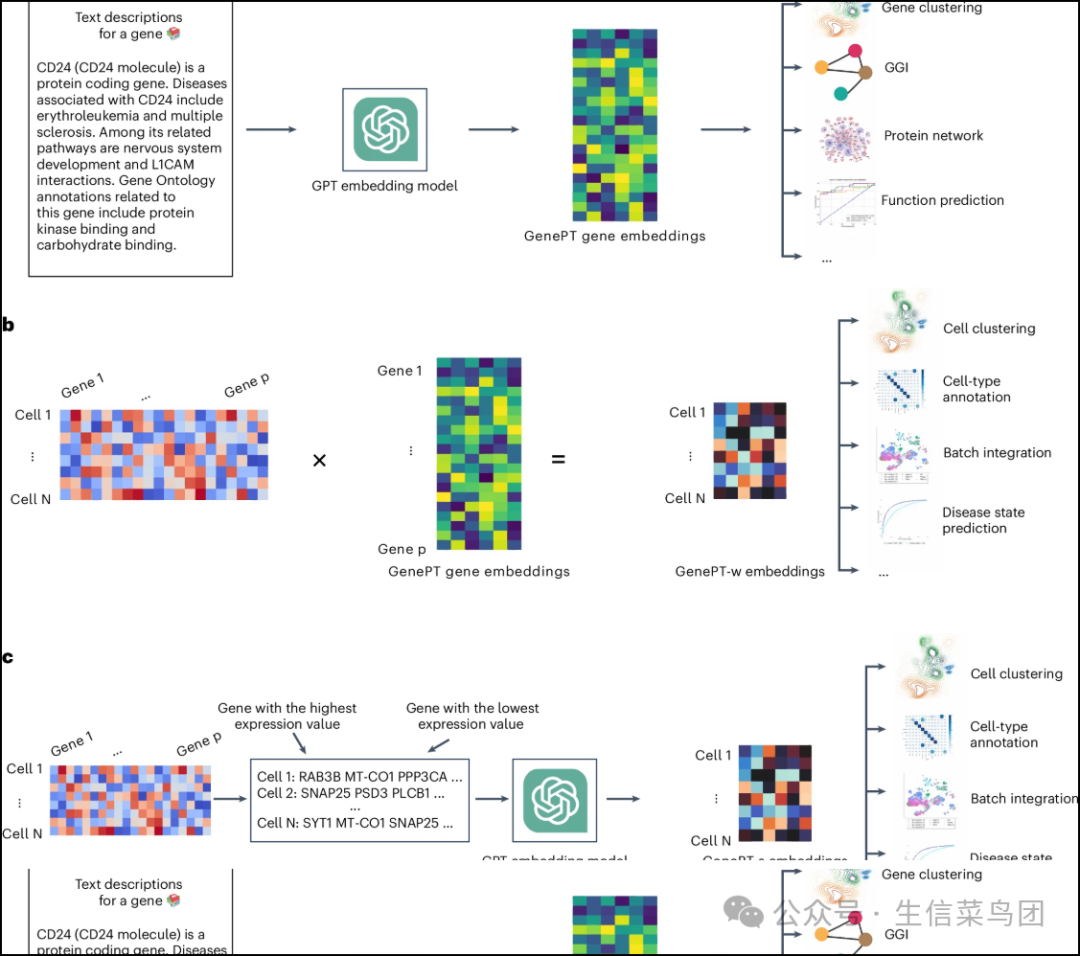 - 因此,在本研究中,我们引入了GenePT——一种替代且互补的方法,通过利用OpenAI的ChatGPT文本嵌入模型来表示基因和细胞,并探讨了使用自然语言编码基因和细胞生物学的可行性(见图1a-c概述)。