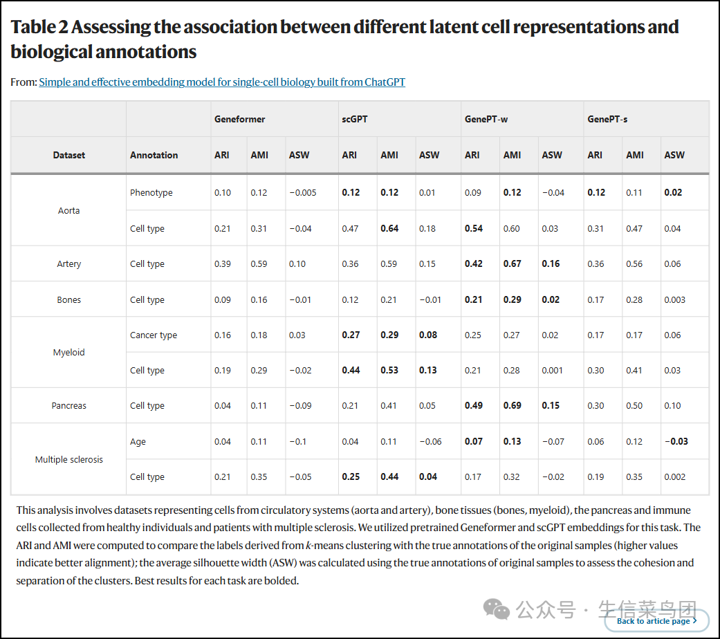 - 评估嵌入与底层细胞状态的关联:我们考虑了以下测试数据集,代表循环系统(主动脉,Li等人原始发表数据的随机20%子集,包含11种细胞类型;动脉,含10种细胞类型)、骨组织(骨骼,含7种细胞类型;骨髓,含3种注释癌症类型和13,468个细胞中的11种细胞类型)、胰腺(含4,218个细胞中的11种注释细胞类型)以及从健康个体和多发性硬化症患者收集的免疫细胞(共3,430个细胞,含18种注释细胞类型和12名捐献者)。对于每个数据集及其相关的元数据注释,我们对预训练的GenePT、Geneformer或scGPT嵌入应用k均值聚类,以获得与元数据注释中的类别匹配的簇。我们选择簇数量k以匹配元数据注释中的类别数量。然后,我们计算ARI和AMI以评估推导的簇标签与真实元数据标签之间的一致性。推断标签与实际标签之间更高的对齐(由更高的ARI或AMI值指示)表明嵌入捕获了更多的生物结构和信号。我们还使用原始样本的真实注释计算ASW,以评估簇的内聚性和分离性。
