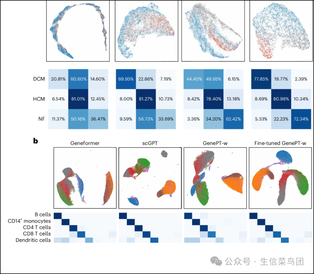 - 我们使用心肌病数据集中 10% 的随机样本和包含健康和扩张主动脉细胞的主动脉数据集中 20% 的随机样本,比较了 GenePT、预训练的 Geneformer 和 scGPT 的性能。
