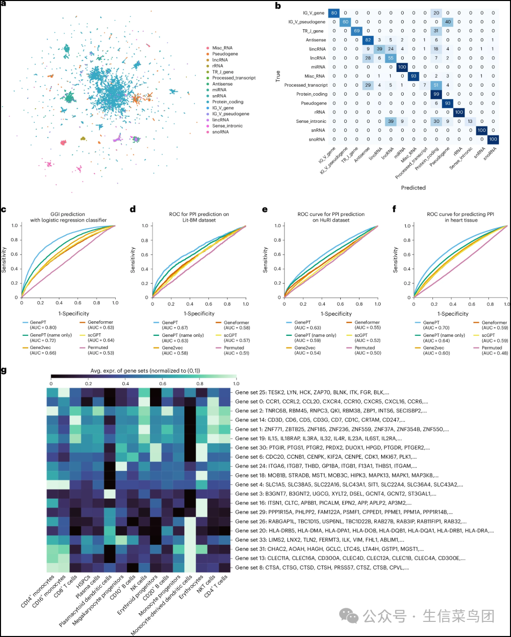 ◉ a, 基因PT嵌入的二维UMAP可视化,按不同的基因功能组着色。◉ b, 利用基因PT嵌入进行基因功能预测的混淆矩阵,结合ℓ2正则化的逻辑回归,在一个随机保留的30%测试集上进行。◉ c, 基于GEO表达数据20的GGI基准数据集上的预测准确性。◉ d, 高质量二元文献数据集49验证的PPIs的预测准确性。◉ e, 人类二元蛋白质相互作用数据集48上的预测准确性。◉ f, 人类心脏组织蛋白质-蛋白质功能相互作用数据集50上的预测准确性。◉ g, 在一个人类免疫组织数据集中,基于基因PT嵌入提取的基因程序在细胞类型特异性激活中的表现(每种程序显示了一组基因的随机子集)。识别出的基因程序在不同细胞类型的平均基因表达模式与Cui等人3先前确定的一致。