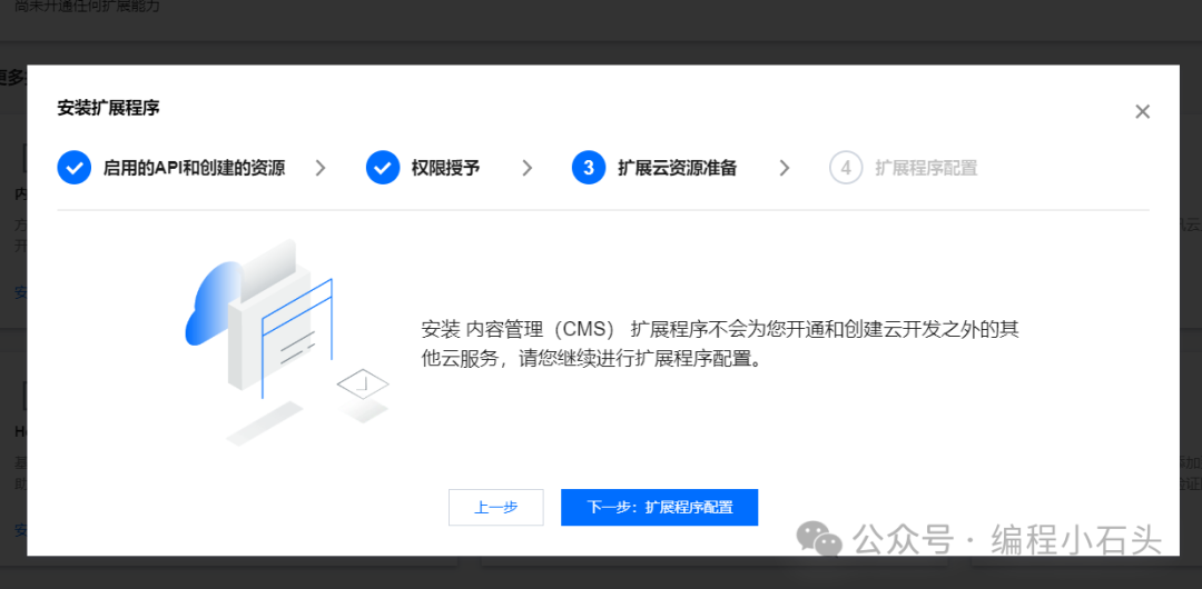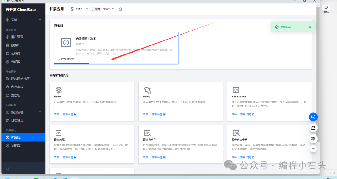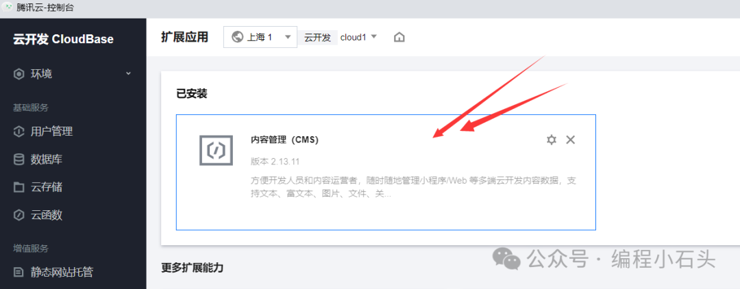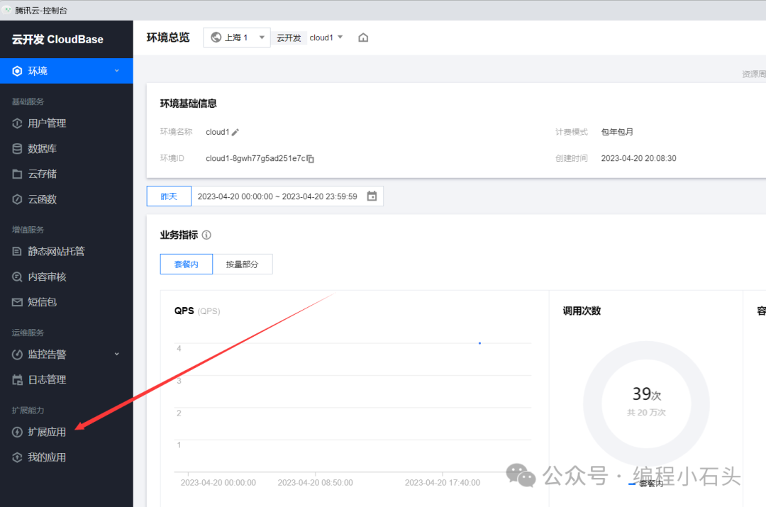 这里可以看到我们的云开发环境,直接点击进去就行。然后点击扩展应用