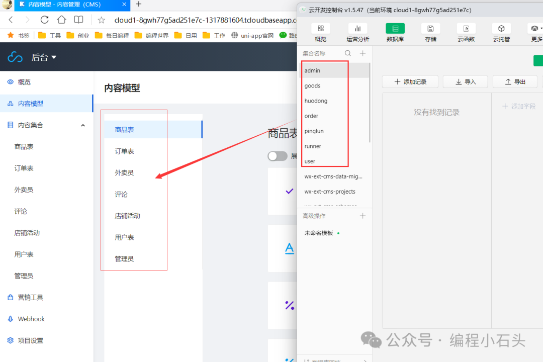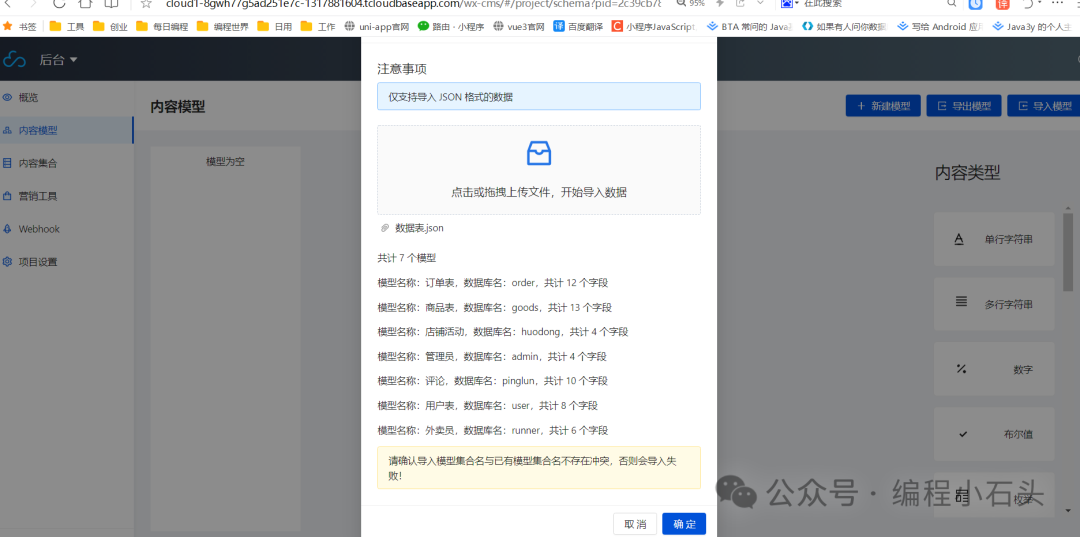 虽然7张能导入5张表,但是呢,我们这5张表无法通过到云开发数据库。这。。。。。。 我们用cms的目的不就是方便管理云开发数据库吗,你这里两边不同步,cms不就显得鸡肋了吗。所以我们要想解决办法。给小程序官方也提意见了。可是他们给出的是一周后才可以修复。。。。。。 那我们着急使用的同学怎么办呢。。。 研究了一天后,终于找到了一个解决方案。