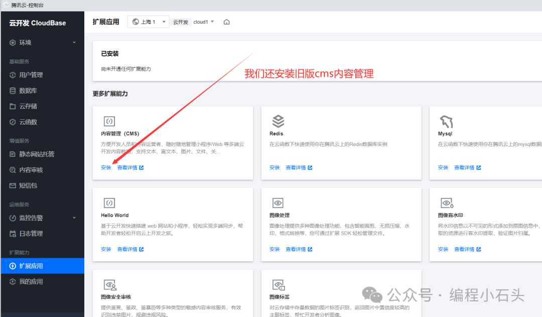 最近越来越多的同学找石头哥,说cms用不了,其实是小程序官方最近又搞大动作了,偷偷的升级的云开发cms(内容管理)以下都称cms,不升级不要紧,这一升级,就导致我们没有办法正常使用cms了。如果你是新开通的cms基本上都会有下面的问题。