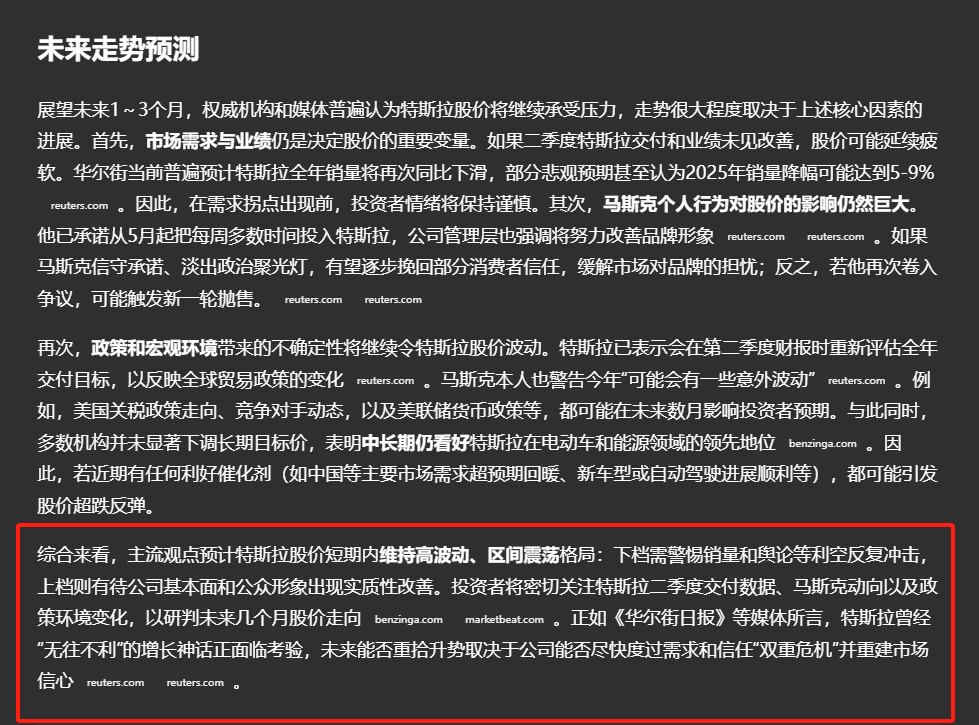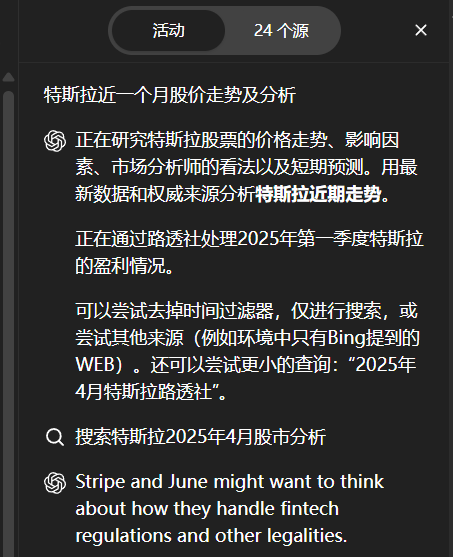 可以从右边栏看到chatgpt的活动,它在不断的读取外网对于“特斯拉”股价的信息。