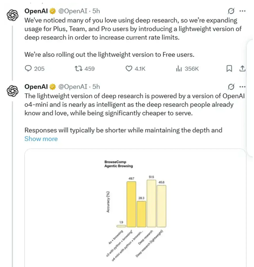 OpenAI最近在周四宣布,想免费用户也开始推送轻量版的Deep Research。这个功能由o4-mini 模型版本提供支持。虽然其能力不及“完整版”深度研究工具,但 OpenAI 称其运行成本更低,因此可以提高用户的使用上限。