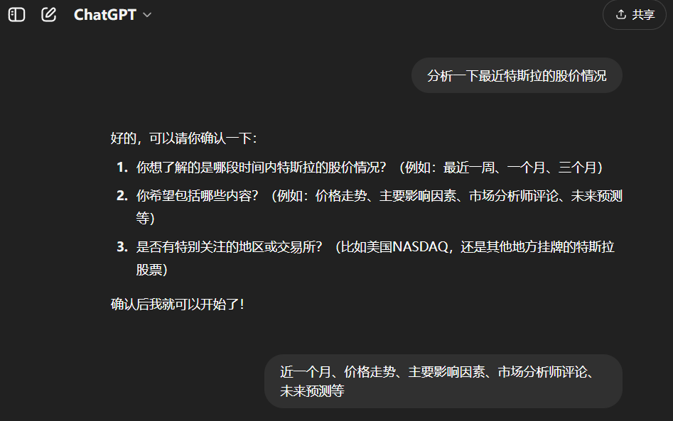 首先它会需要你回到要查询“特斯拉”哪些方面的情况。比如想了解最近一个月特斯拉的股价情况等等。
