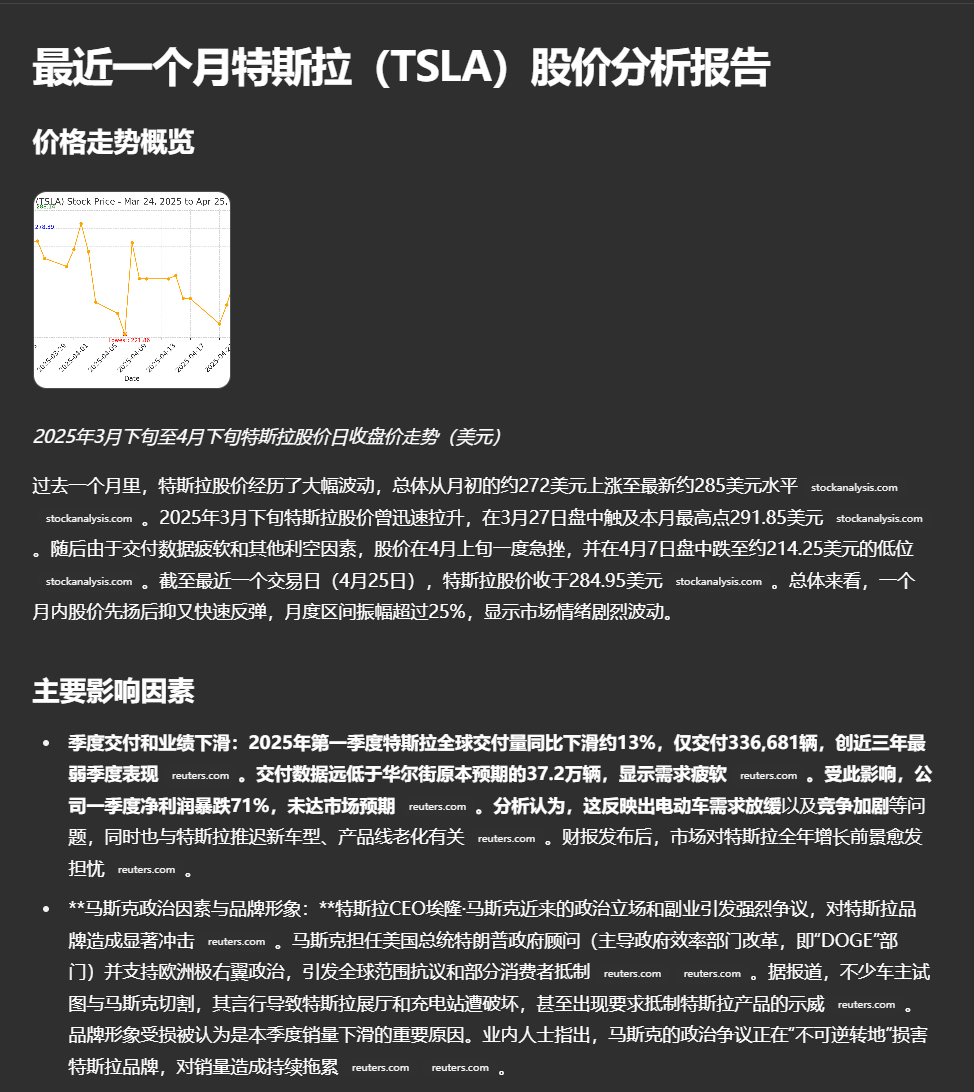 最后来看看它生成的效果:它用python先画了具体的图片,表示了一下近一个月特斯拉的股价信息。