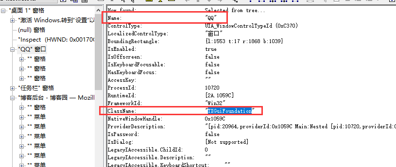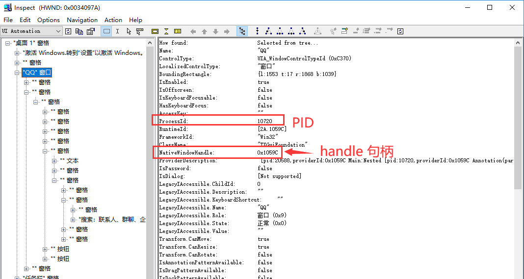 1.通过Inspect.exe查看窗口句柄,如下图所示: