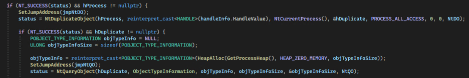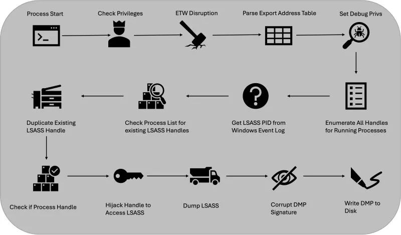 由于大多数防病毒和端点检测与响应 (EDR) 解决方案都会检测任何试图直接打开 LSASS 句柄的进程,因此 LetMeowIn 使用了 SkelSec 引入的技术,通过 NtDuplicateObject 函数获取现有的 LSASS 打开句柄的副本。有了 LSASS 打开的句柄,LetMeowIn 就可以转储 LSASS 的内容,从而从转储文件中提取凭据。