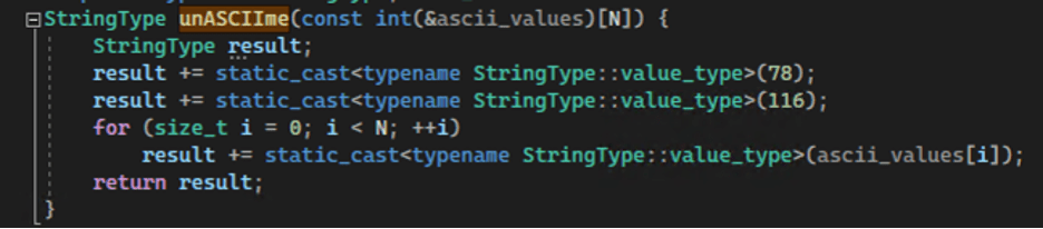 此外,LetMeowIn 会将函数名称用 Unicode 代码点编码,并将值存储在数组中,从而混淆 WinAPI 函数。调用该数组时,LetMeowIn 会调用一个名为 unASCIIme 的函数,该函数将数组解码为字符串形式的 WinAPI 函数名称。