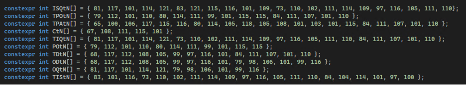 例如,“ISQtN[] = { 81, 117, 101, 114, 121, 83, 121, 115, 116, 101, 109, 73, 110, 102, 111, 114, 109, 97, 116, 105, 111, 110}”将解码为“QuerySystemInformation”。