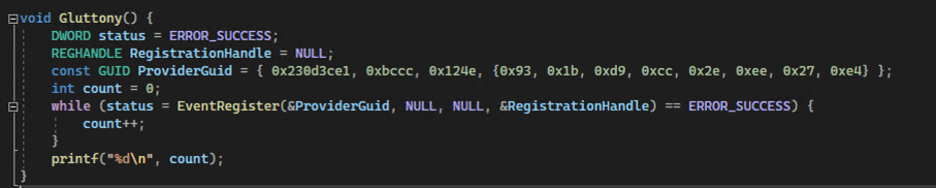 LetMeowIn 有一个名为 Gluttony 的函数,该函数实现了“acebond”首次记录的一种技术,该技术试图通过限制单个进程所能拥有的 ETW 提供程序数量来阻止其从进程中收集信息。Gluttony 函数利用 EventRegister 函数循环注册提供程序,直到达到最大数量后,LetMeowIn 才能注册任何合法的提供程序。